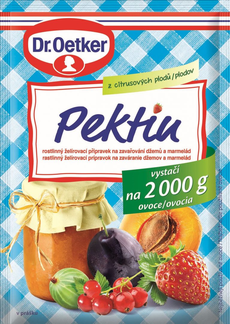 Zavařovací sezona ještě nekončí! Pokud se teprve nyní chystáte na přípravu domácích marmelád a džemů, hodí se vám stoprocentně rostlinný Pektin Dr.Oetker vyrobený z citrusů (bez konzervantů). Jeden balíček bude stačit pro zpracování až 2 kilogramů ovoce, k němuž podle své chuti přidáte cukr – doporučuje se 700 až 1000 g cukru, ale je to na vás. Pektin působí jako přírodní zahušťovadlo, s nímž váš džem či marmeláda dosáhnou požadované konzistence.